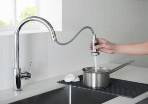 3. Изливы с гибким или вытяжным шлангом. Улучшенный поворотный излив для кухни. Некоторые модели позволяют менять режимы напора потока воды. Да, силиконовый или металлический шланг излива менее долговечен, зато мыть посуду – одно удовольствие!